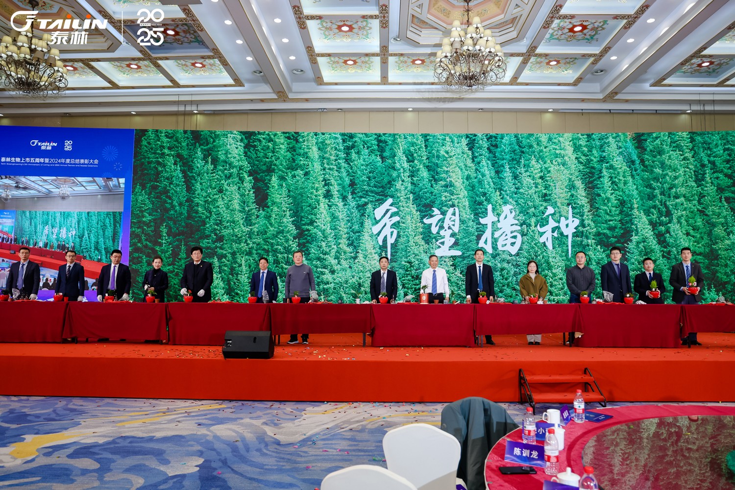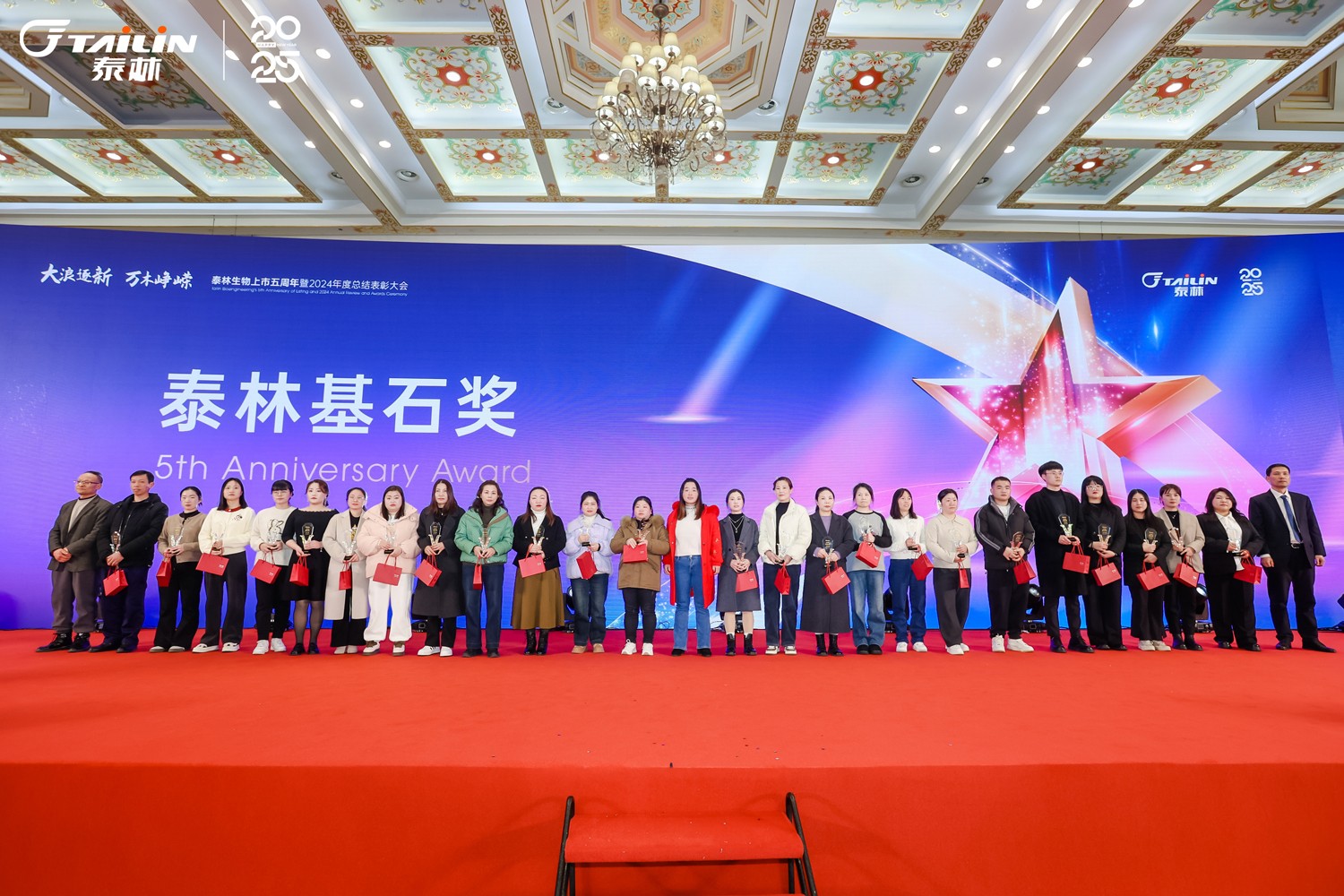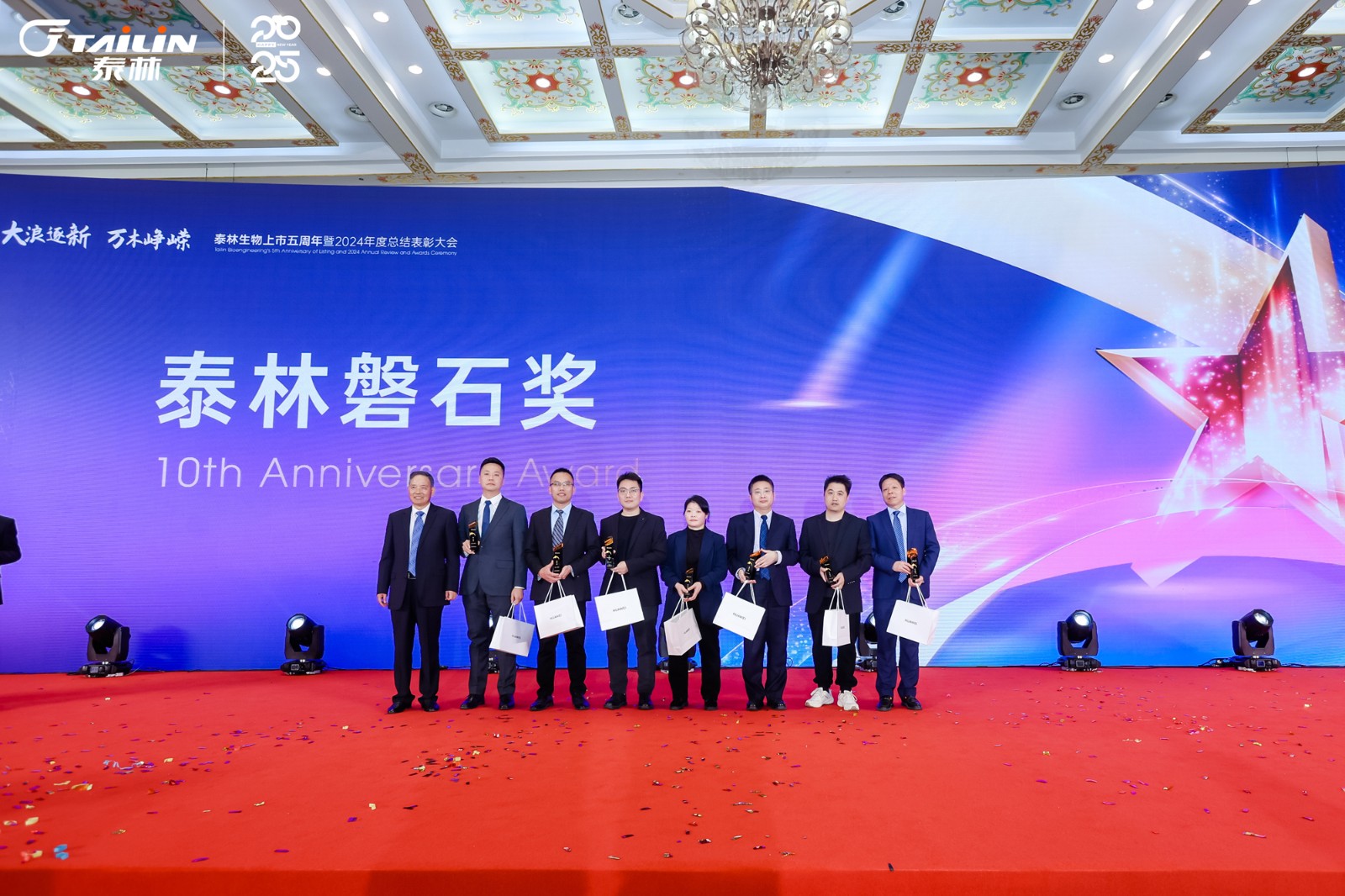 1月14日,“大浪逐新 萬(wàn)木崢嶸”——泰林生物上市五周年暨2024年度總結(jié)表彰大會(huì)在一片熱烈而莊重的氛圍中拉開帷幕。浙江泰林生物技術(shù)股份有限公司董事長(zhǎng)葉大林先生,浙江泰林生物技術(shù)股份有限公司副總裁沈志林先生、夏信群先生,浙江泰林生物技術(shù)股份有限公司董事倪崖先生、楊忠智先生共同出席盛典。泰林水生態(tài)領(lǐng)域合作伙伴江蘇宏眾百德生物科技有限公司總經(jīng)理孫蓓麗博士一行受邀到場(chǎng)。老友重聚,新友相逢,舉杯暢飲,共同回顧2024泰林奮進(jìn)之路!