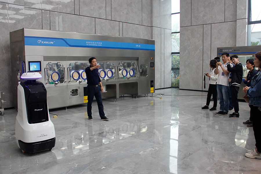 泰林生物副總經(jīng)理夏信群向各位領(lǐng)導(dǎo)、專家們介紹正在自動行走的滅菌機器人,以及應(yīng)用于CAR-T細胞治療的細胞治療工作站。